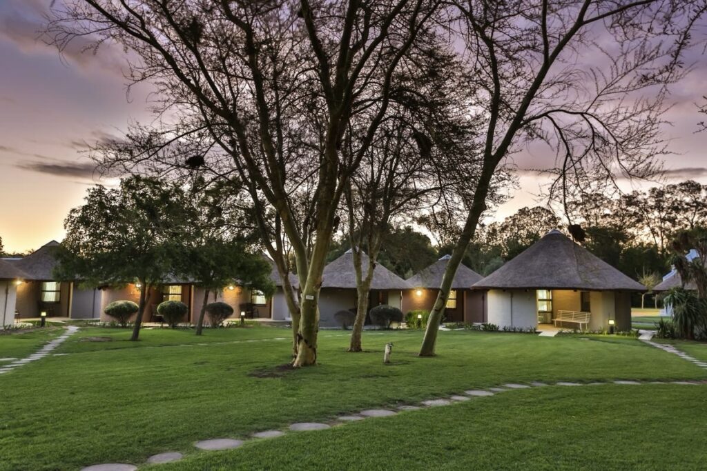 At Protea Hotel by Marriott Oudtshoorn Riempie Estate, thatched rondavel‑style rooms sit among leafy gardens, with an outdoor pool and plenty of space to unwind – ideal for slow Karoo evenings after a day on the road.